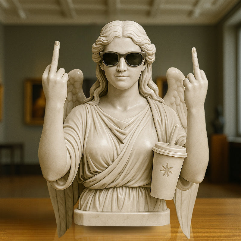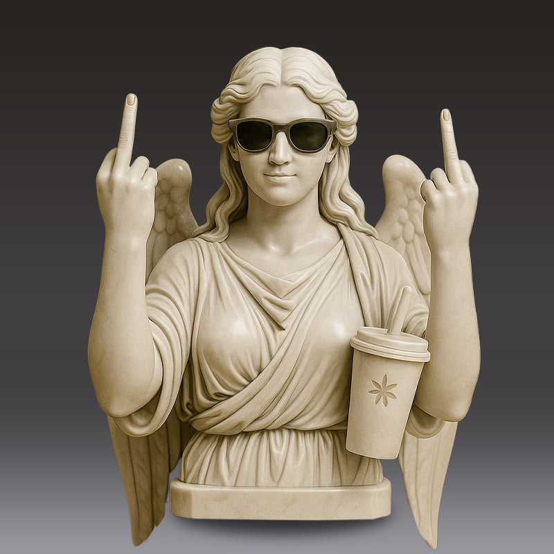 This isn’t your grandma’s angel figurine. With coffee in hand and a bold double salute, she’s here to protect your space with sass, strength, and a bit of savage humor.